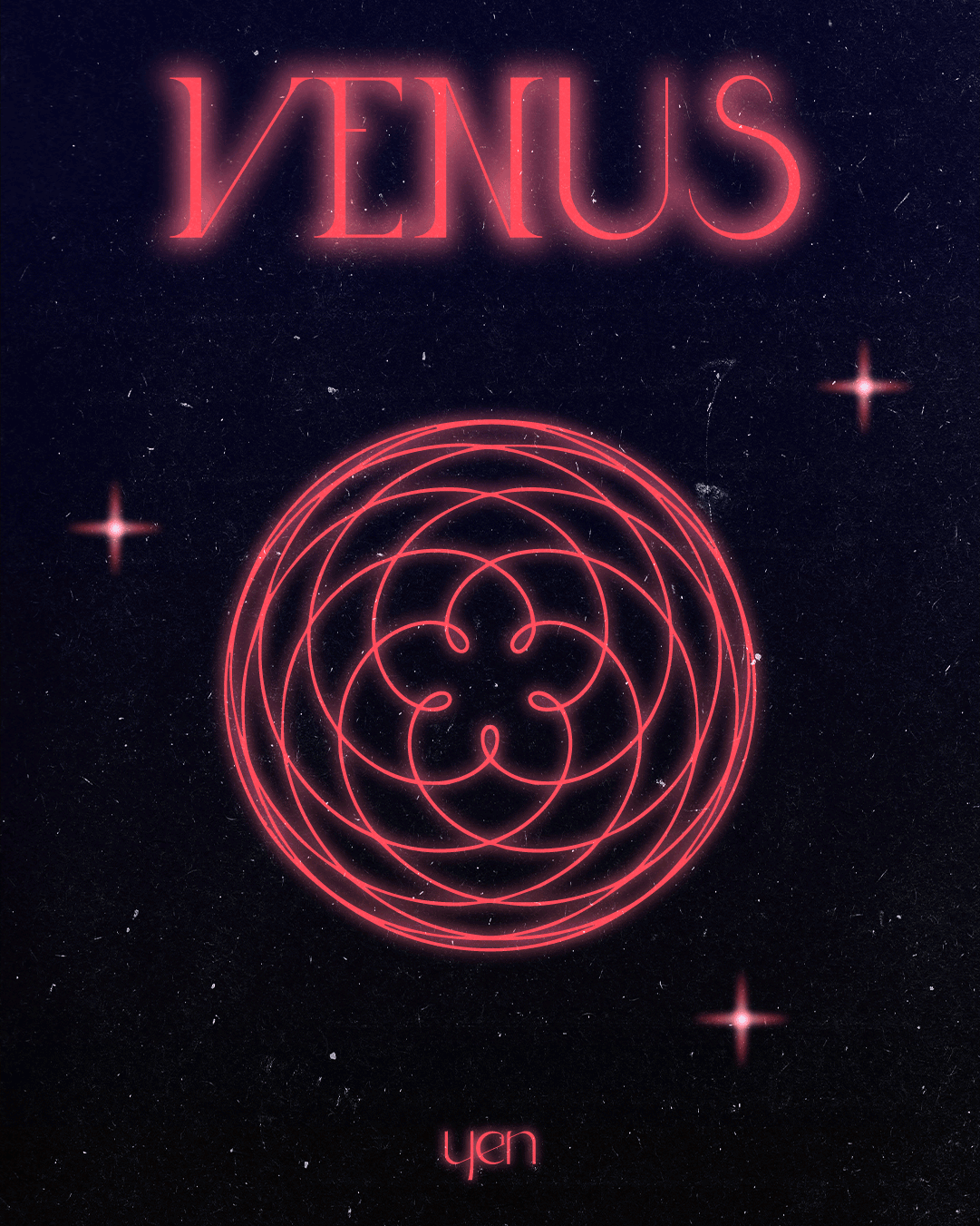 The palette is a night sky: deep black and dark blue, speckled with grain and star flares. Nothing here is decorative. Every element was chosen because it belongs specifically to Venus, not to wellness in general.